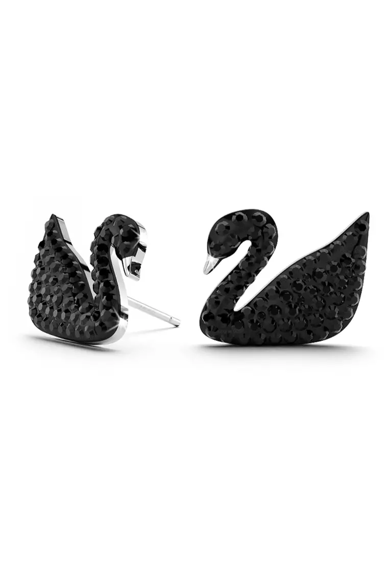 Solid 925 Sterling Silver Jet Swan Stud Earrings - Silver/Black