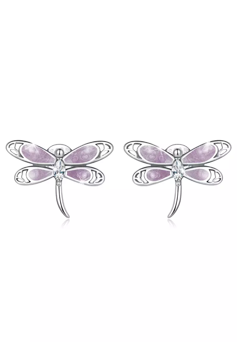 Solid 925 Sterling Silver Purple Duo Vintage Dragonfly Stud Earrings