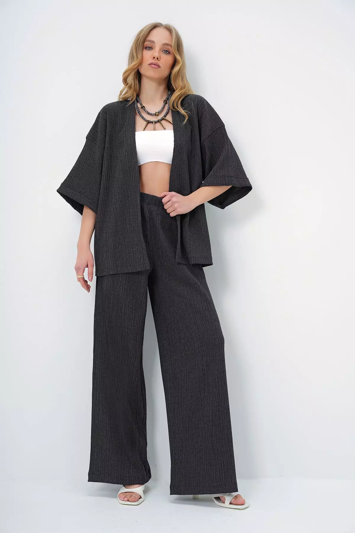 AlacatiWomen's Anthracite Double Sleeve Wrap Fabric Summer Kimono And Trouser Set2409.001398.00