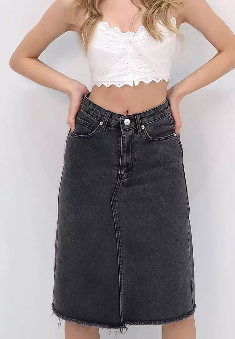 Women's Anthracite High Waist 5 Pockets Midi Length Jean Skirt Alc-X13655