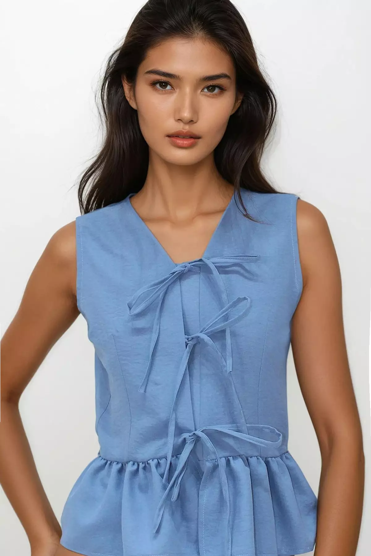 AlacatiWomen's Aviator Blue V-Neck Bow Detailed Flounce Skirt Aerobin Blouse Alc-X141791799.001089.00