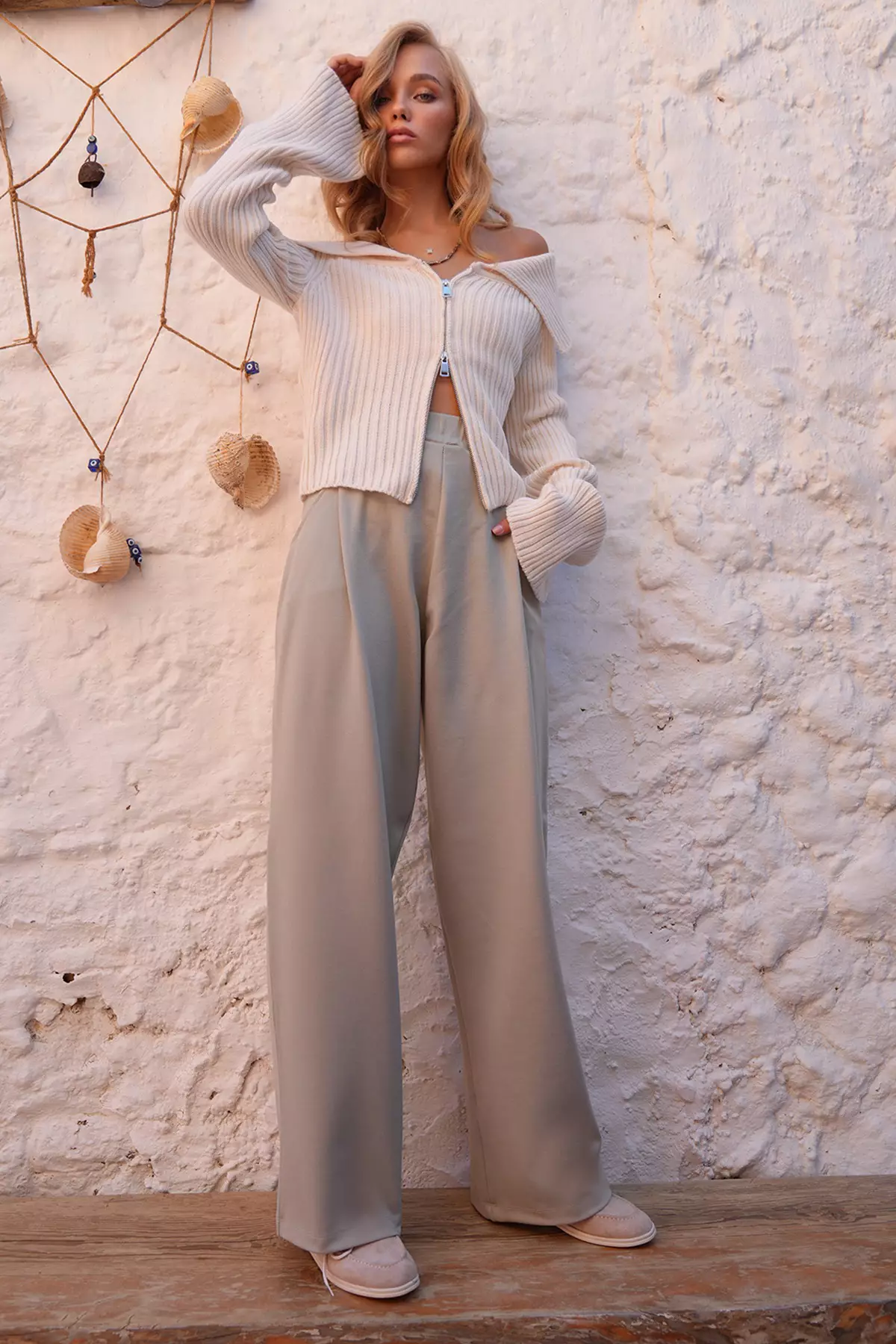 Women's Beige Pleated Detailed Knitted Palazzo Trousers Alc-X14535