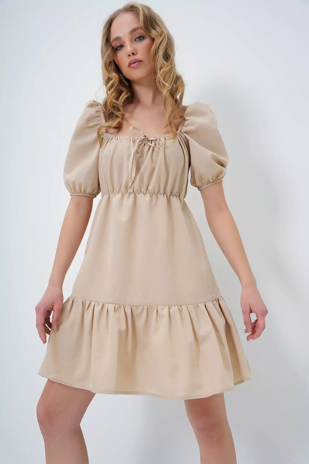 AlacatiWomen's Beige Square Neck Balloon Sleeve Poplin Mini Dress1939.001615.73