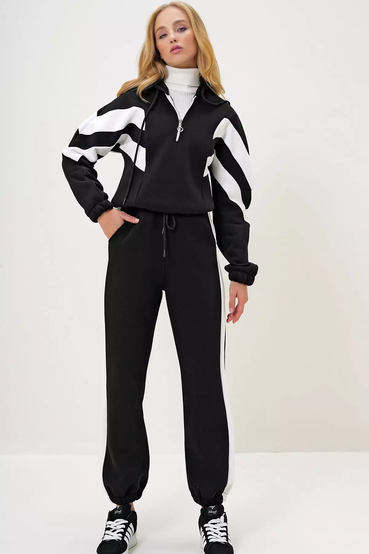 Women's Black Hooded Half Zippered Sweatshirt and Elastic Leg Tracksuit Set