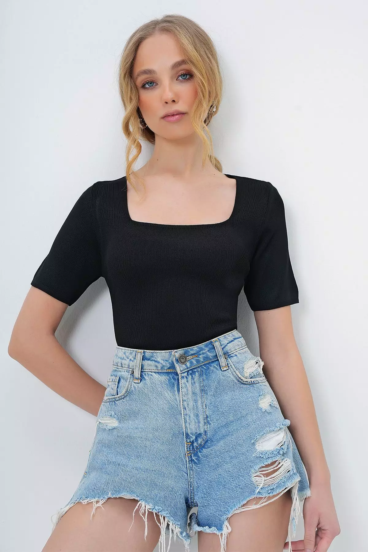 Women's Black Square Neck Short Sleeve Seasonal Knitwear Blouse