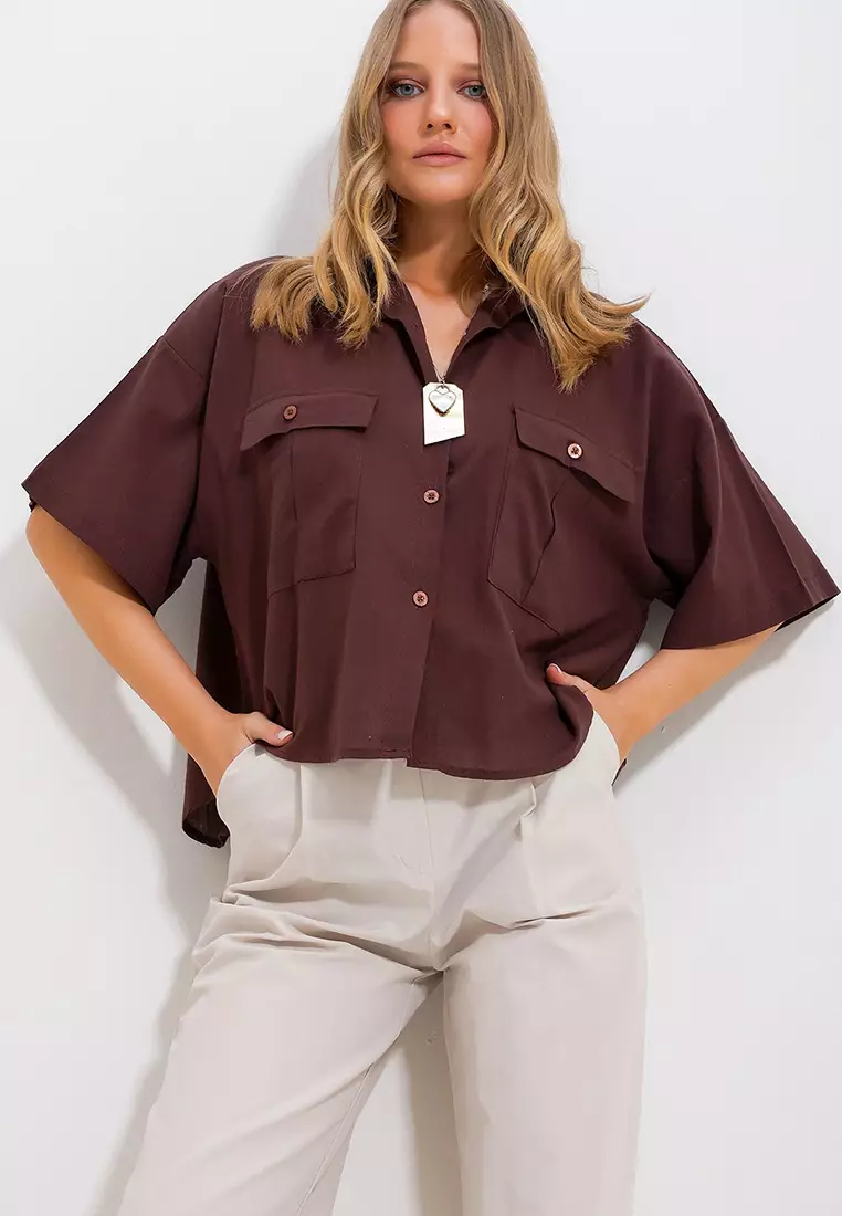AlacatiWomen's Brown Double Pocket Half Sleeve Linen Shirt Alc-X99911649.00