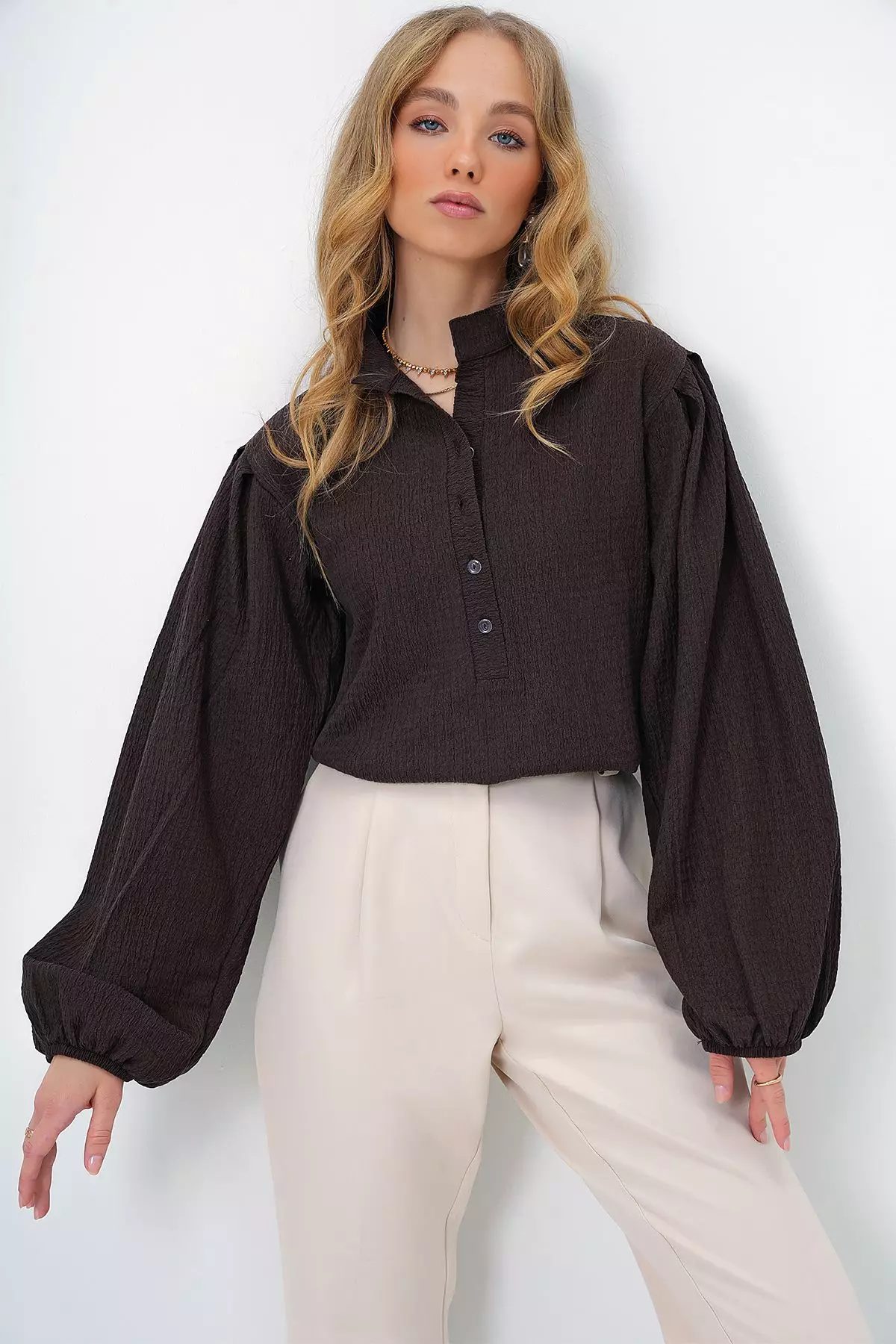 AlacatiWomen's Brown Judge Collar Button Front Balloon Sleeve Textured Wrap Shirt Blouse1689.001299.00