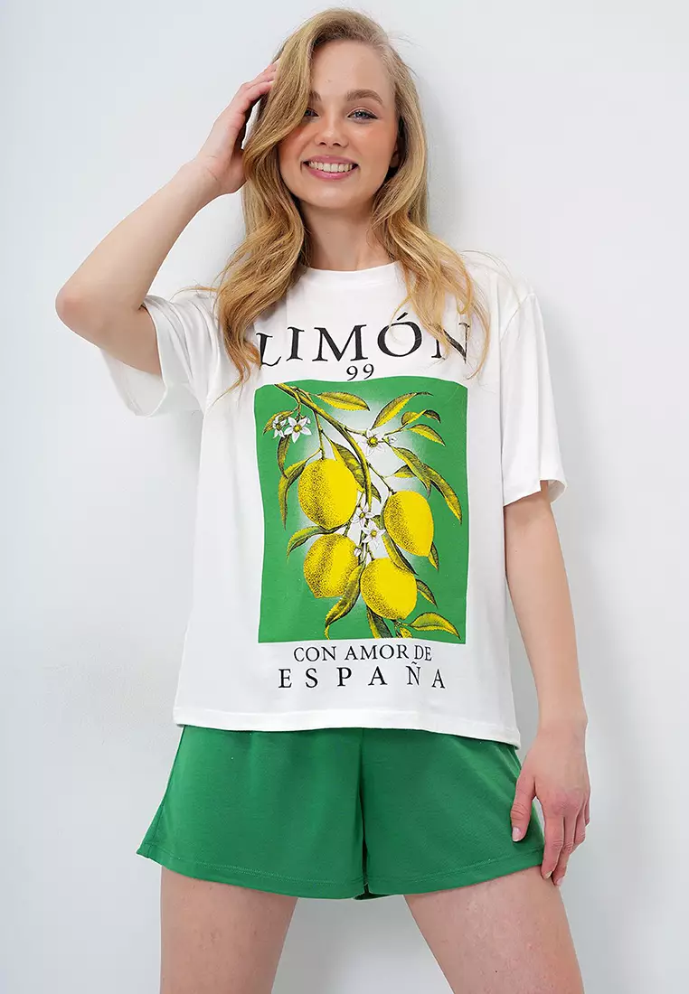 AlacatiWomen's Green Lemon Printed Cotton Basic T-Shirt And Shorts Pajama Set Pjm-X139031269.001032.00