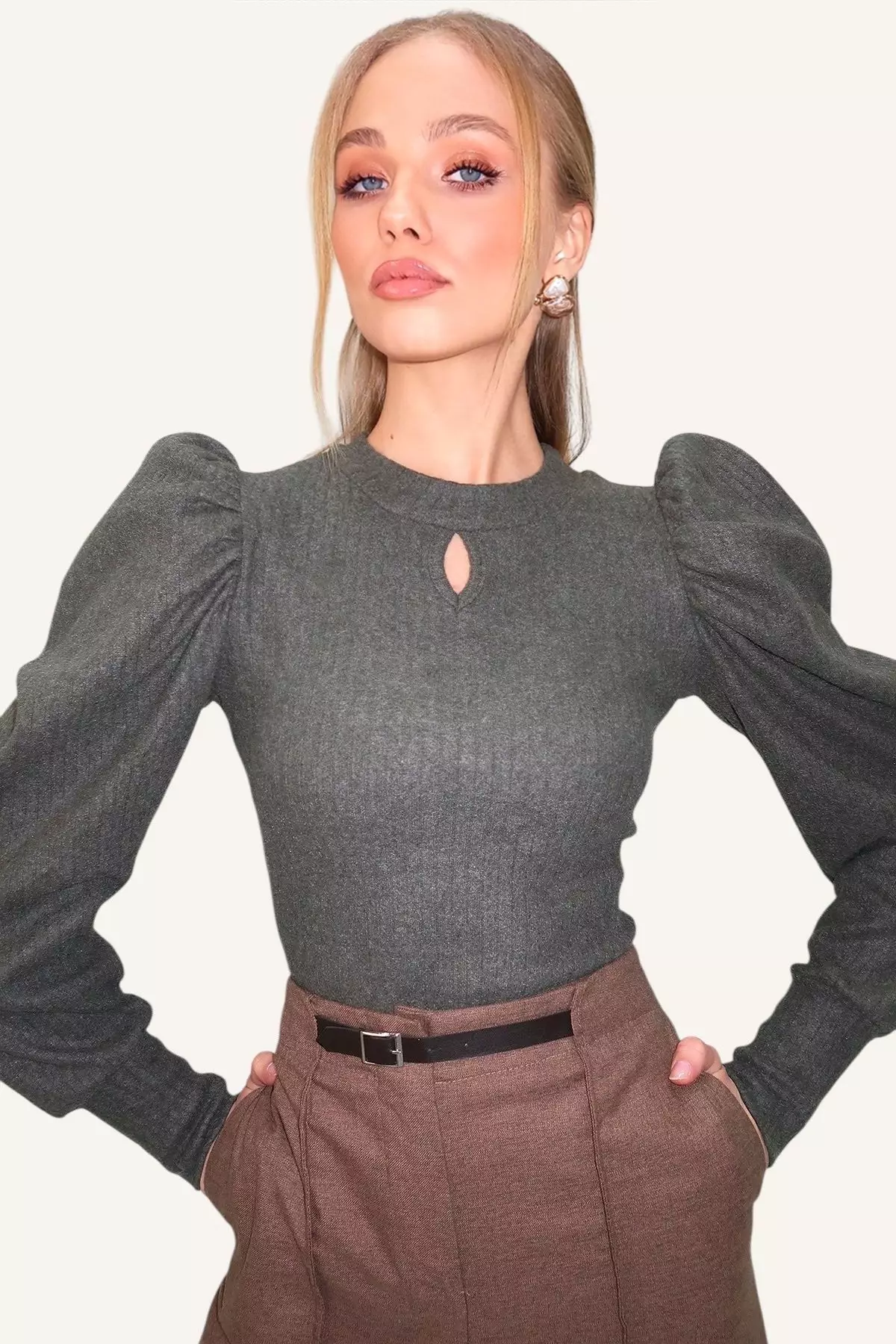 AlacatiWomen's Khaki Crew Neck Drop Neck Princess Sleeve Knitwear Blouse1069.00866.00