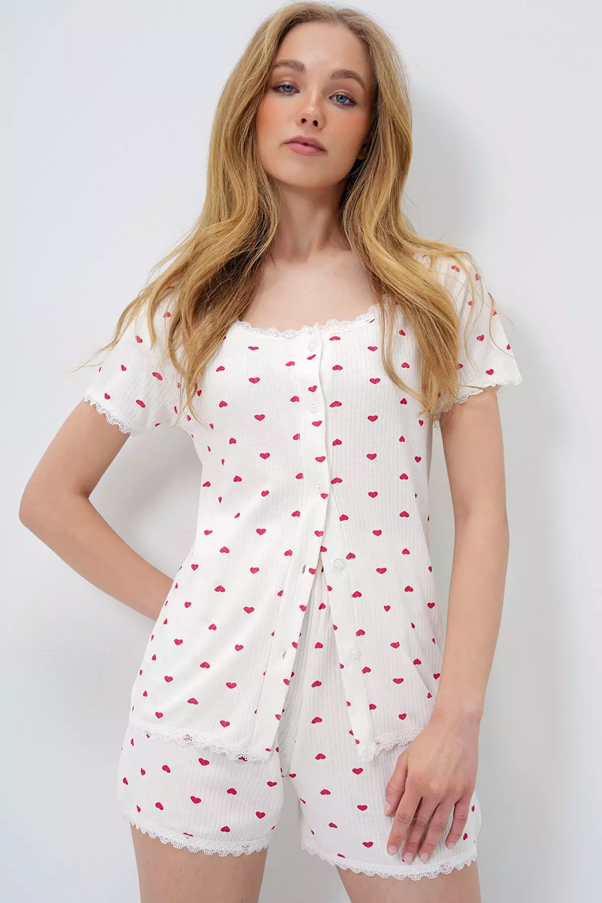 AlacatiWomen's Mini Heart Red Scallop Detailed Cotton Wide Collar Shirt And Shorts Pajamas Set Pjm-X138991709.001289.90