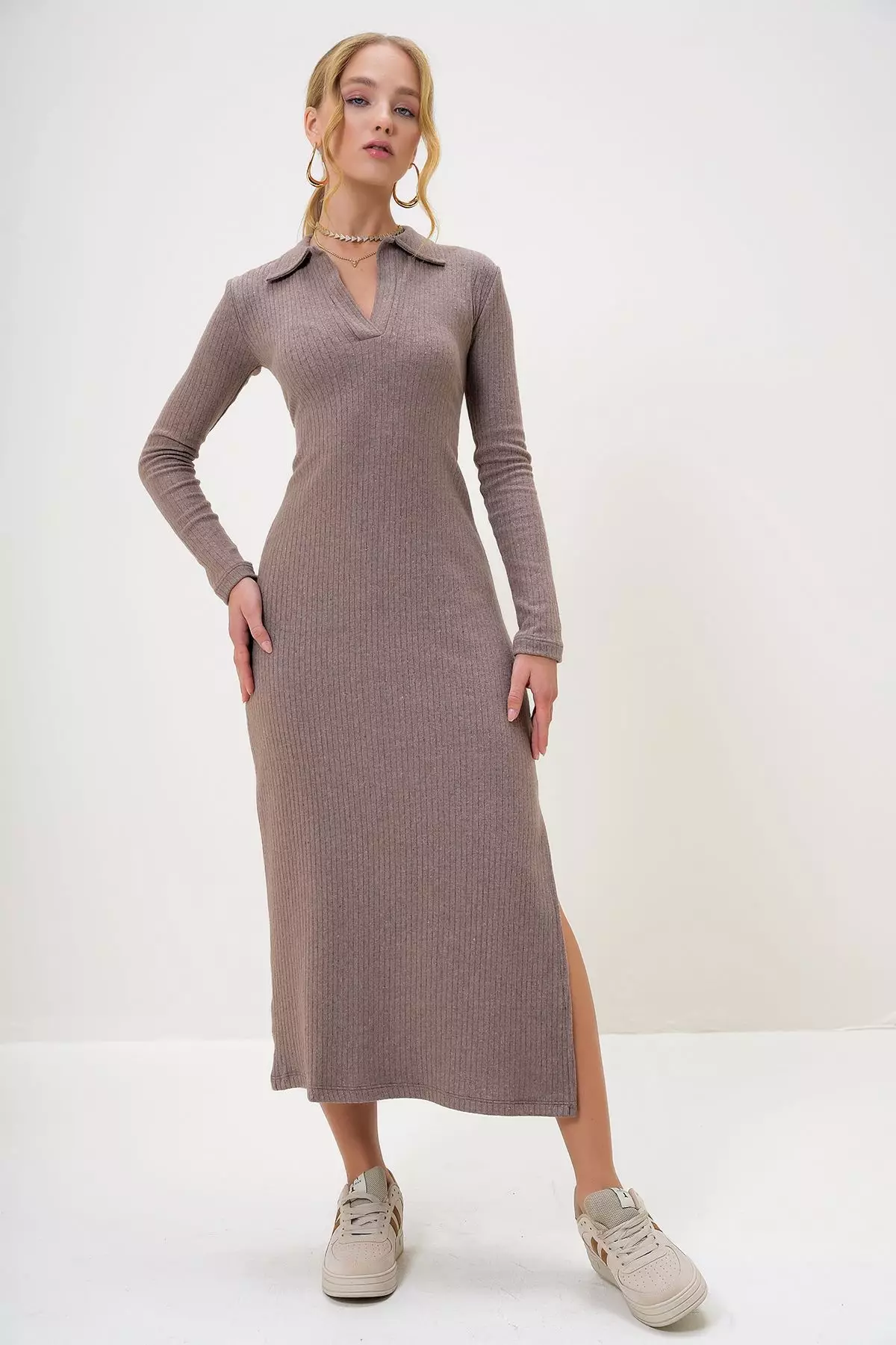AlacatiWomen's Mink Polo Collar Half Placket Side Slit Interlock Fabric Dress849.00770.00