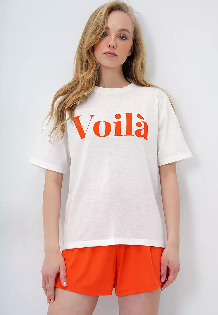 AlacatiWomen's Orange Front Text Printed Cotton Basic T-Shirt And Shorts Combed Cotton Bottom Top Set Pjm-X139021179.001112.90