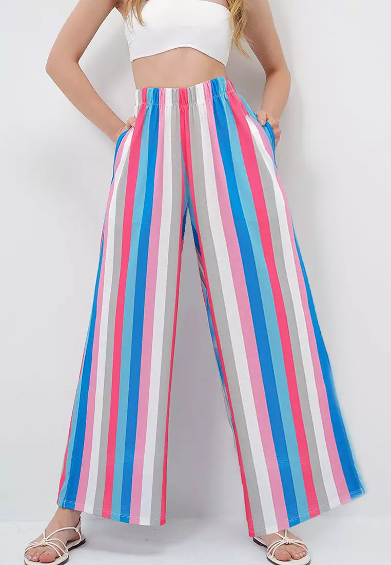 AlacatiWomen's Pink Blue Double Pocket Line Patterned Wide Leg Summer Trousers Alc-X141421179.00829.00
