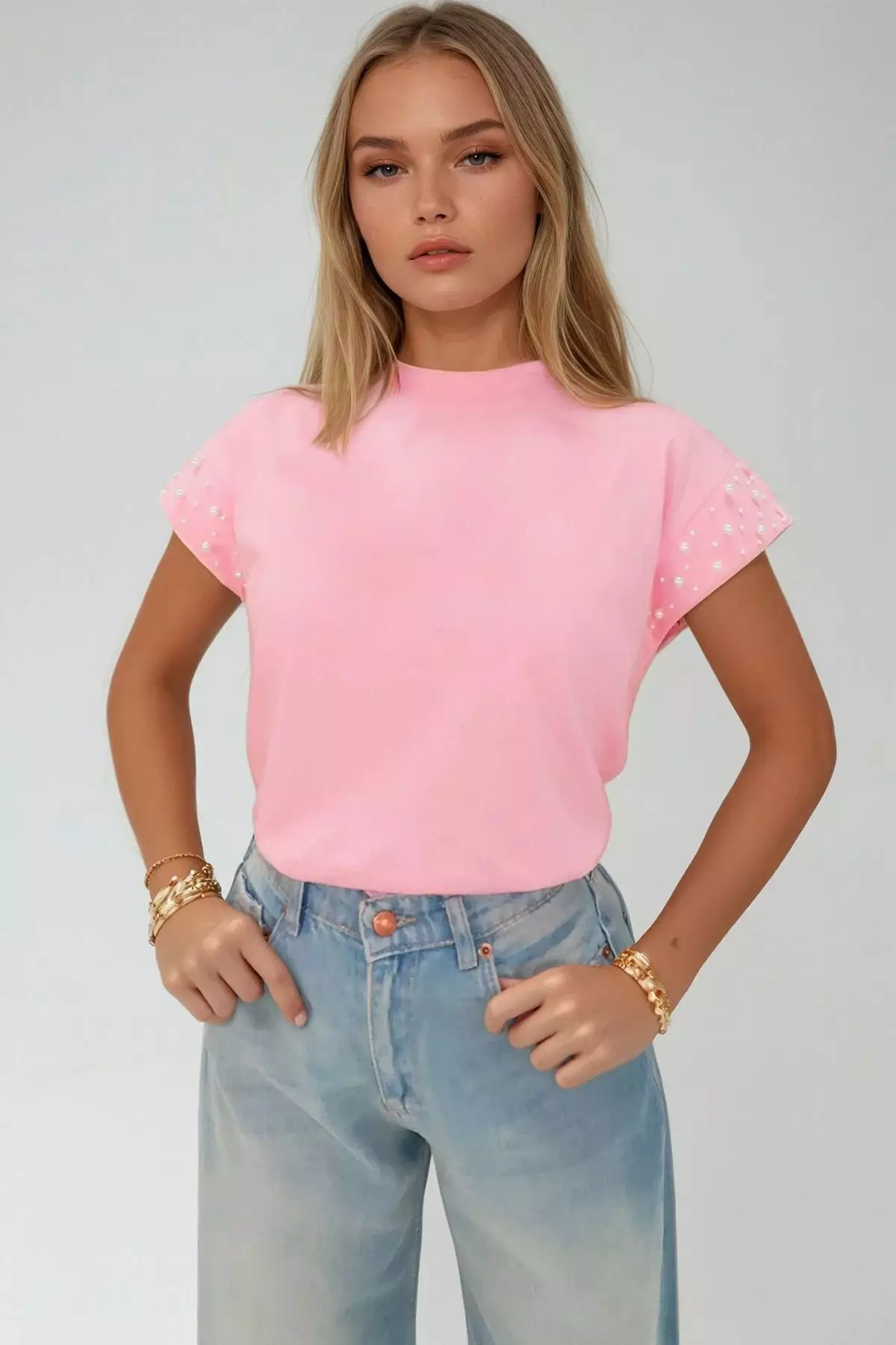 Women's Pink Crew Neck Pearl Studded Sleeveless Blouse