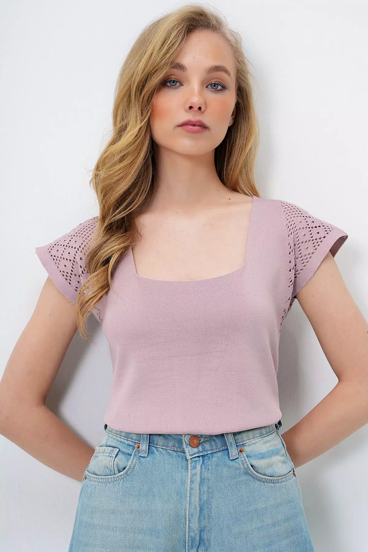 Women's Powder Square Neck Openwork Summer Knitwear Blouse