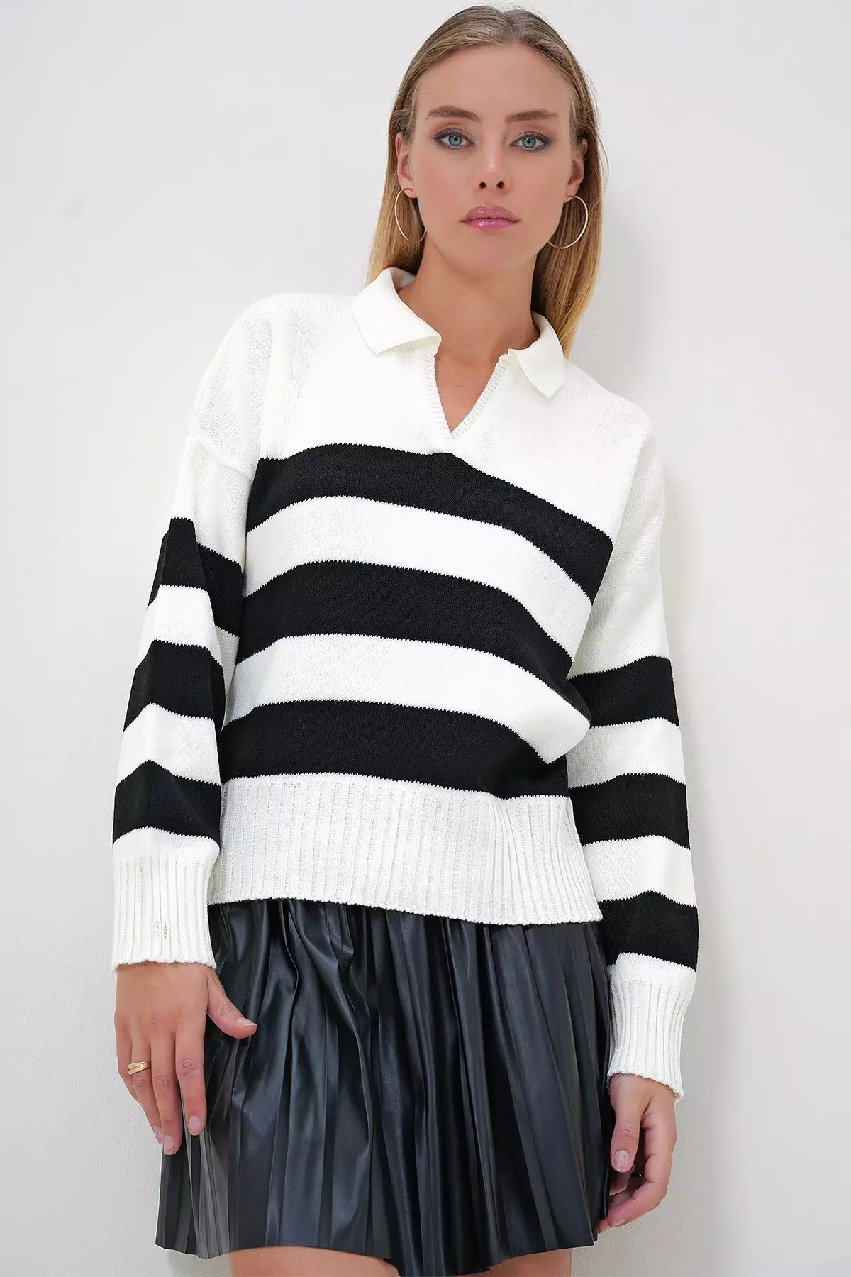 Women's White Black Polo Neck Half Placket Color Block Sweater
