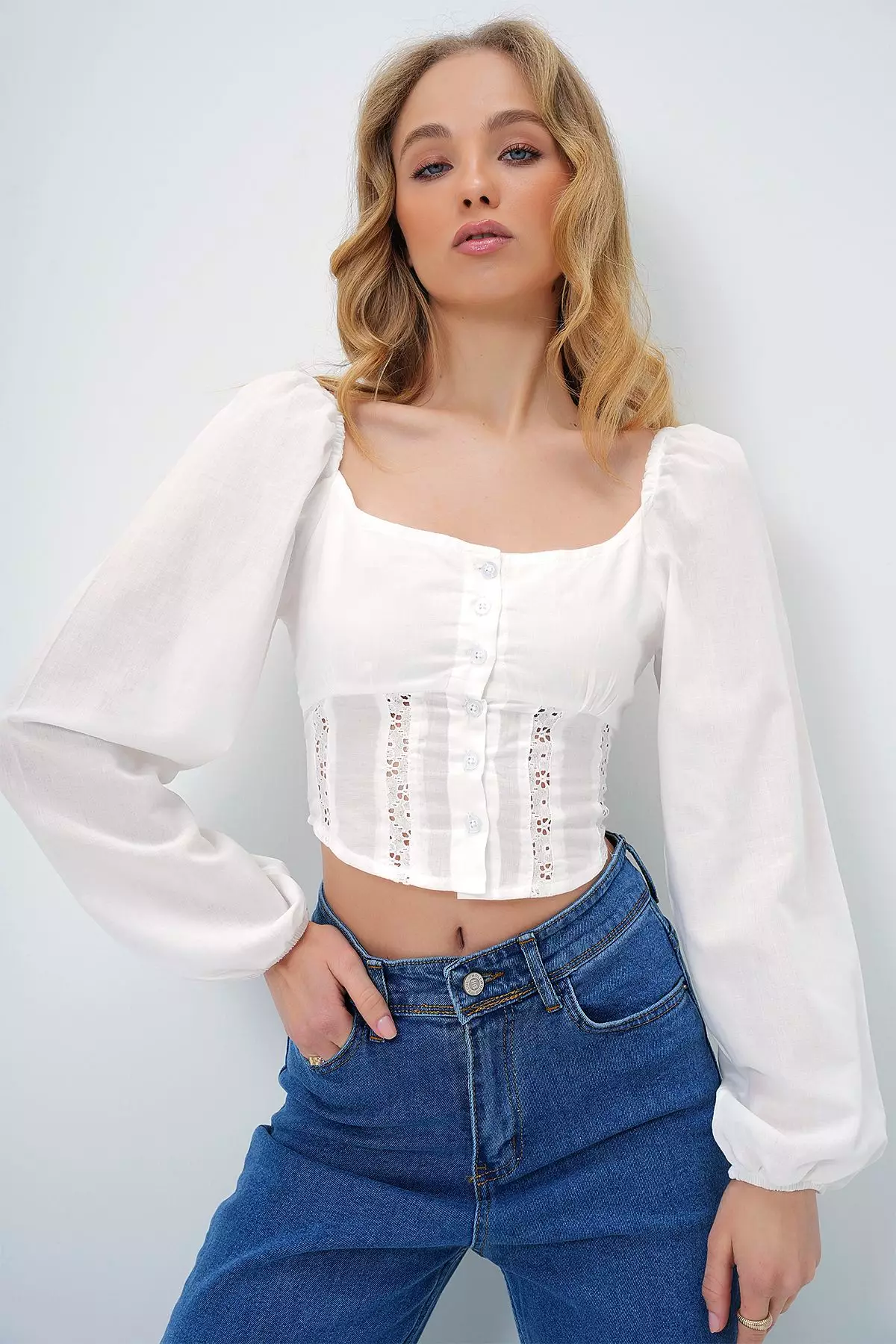 Women's White Square Collar Back Gipel Balloon Sleeve Woven Crop Blouse