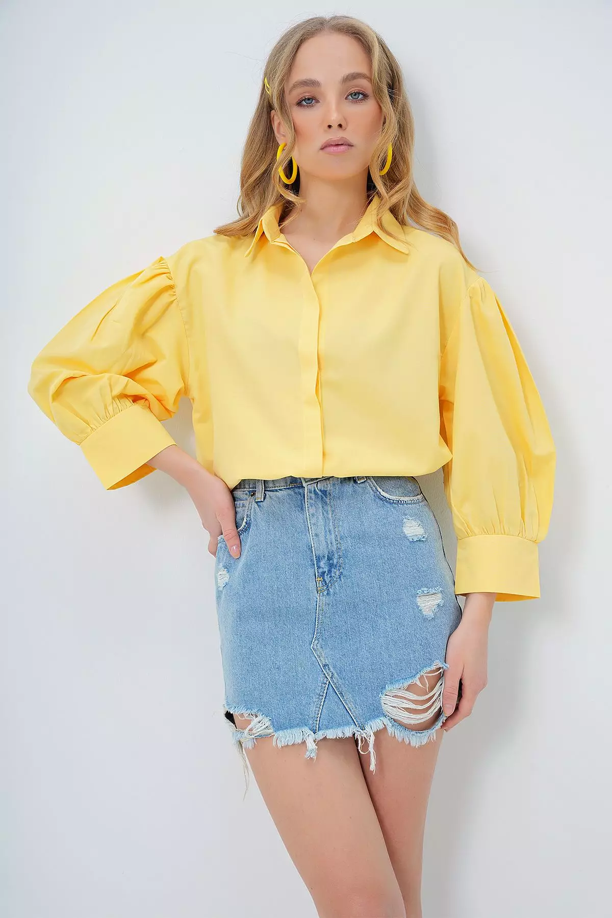 Women's Yellow Balloon Sleeve Hidden Placket Basic Poplin Shirt
