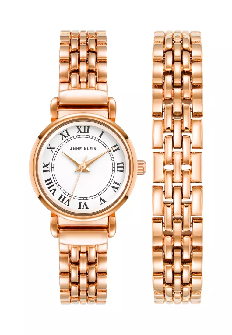 Anne Klein AK4144RGST0000 rose gold tone round watch with white dial and roman numeral index and 1 pc rose gold tone bracelet