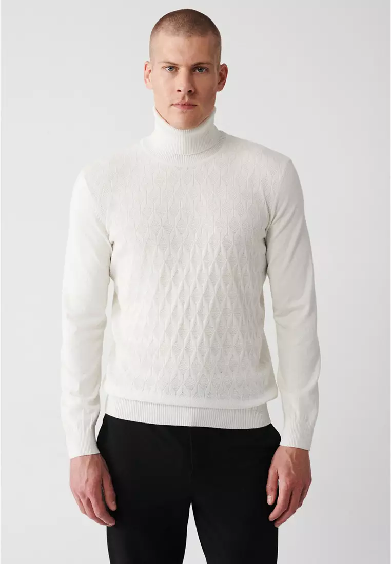 Men's Ecru Turtleneck Cotton Patterned Knitwear Sweater A32Y5198