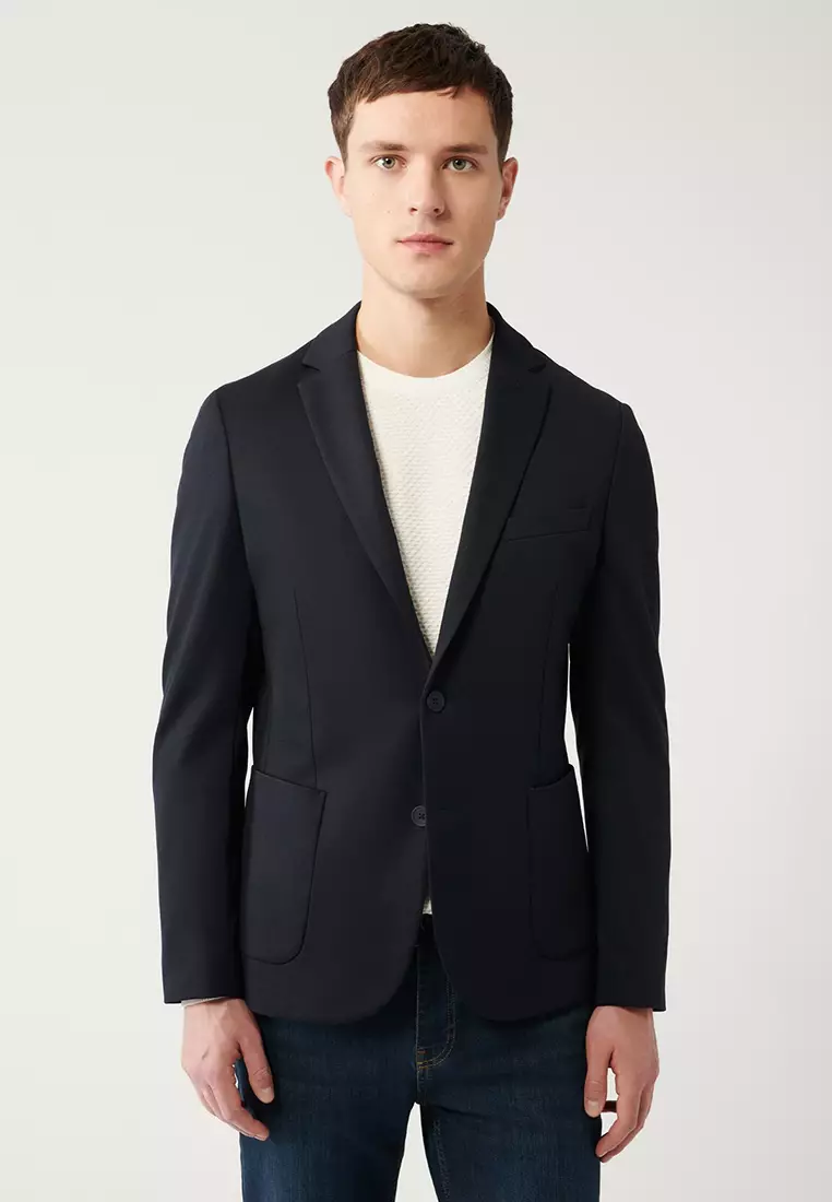 Men's Navy Blue Mono Collar Double Slit Unlined Knitted Jacket B004001