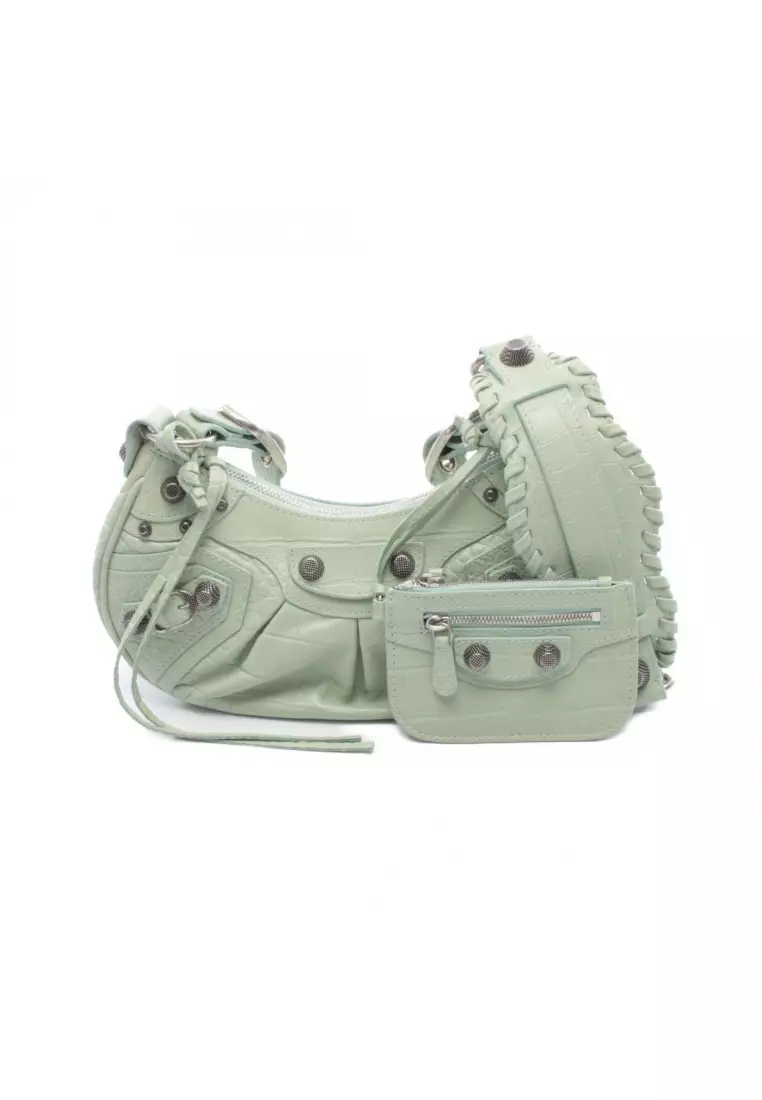 Pre-Loved BALENCIAGA LE CAGOLE Le Cagoule Shoulder bag leather Light green croc embossed