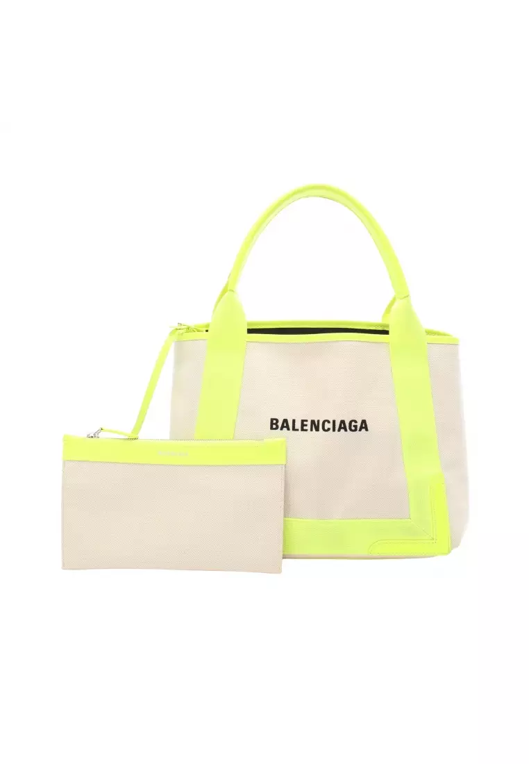 BALENCIAGAPre-Loved BALENCIAGA NAVY CABAS S navy hippopotamus Handbag tote bag canvas leather ivory yellow Neon color48977.00