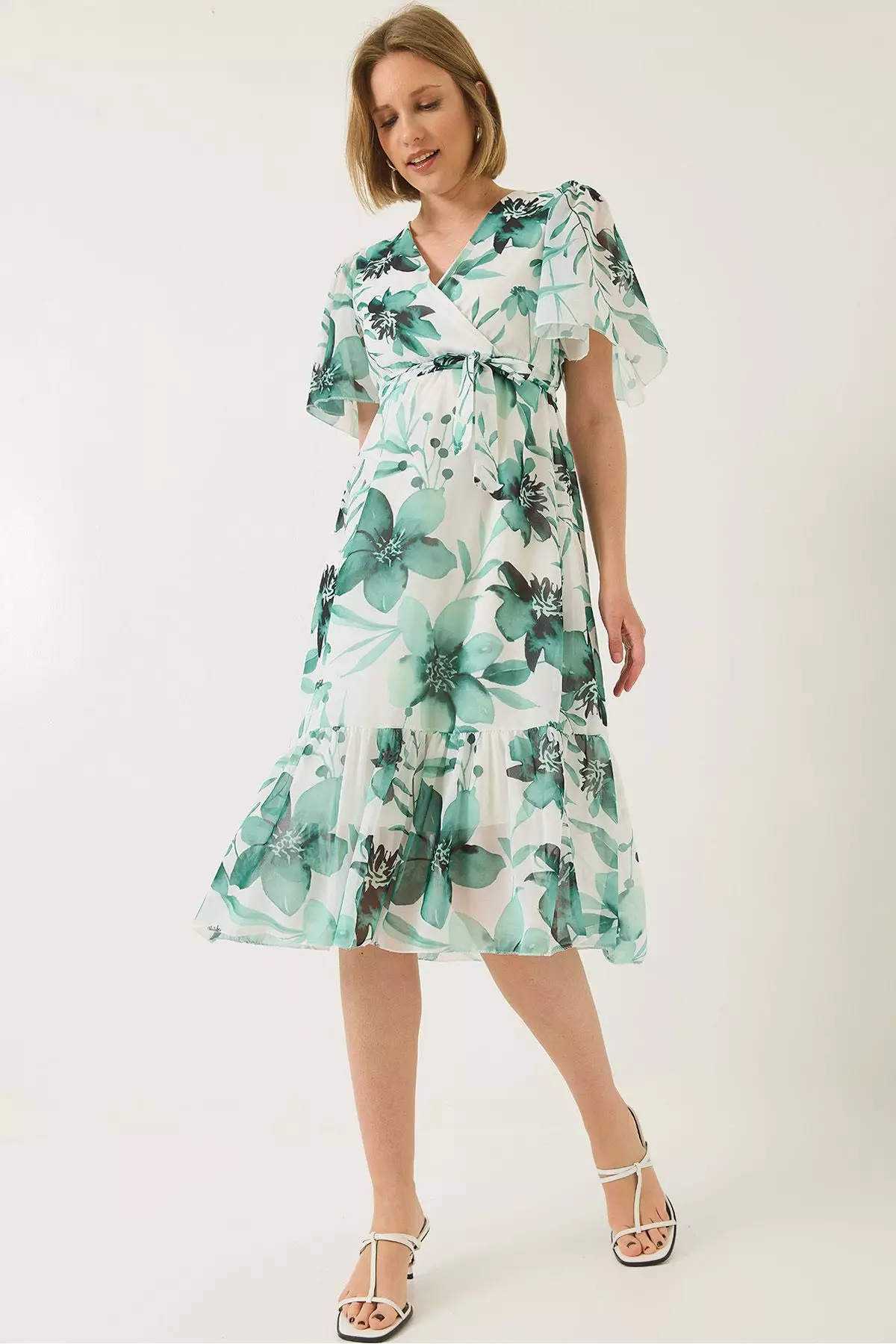 Women's Double Breasted Collar Elastic Waist Belted Lined Patterned Chiffon Dress 60283211
