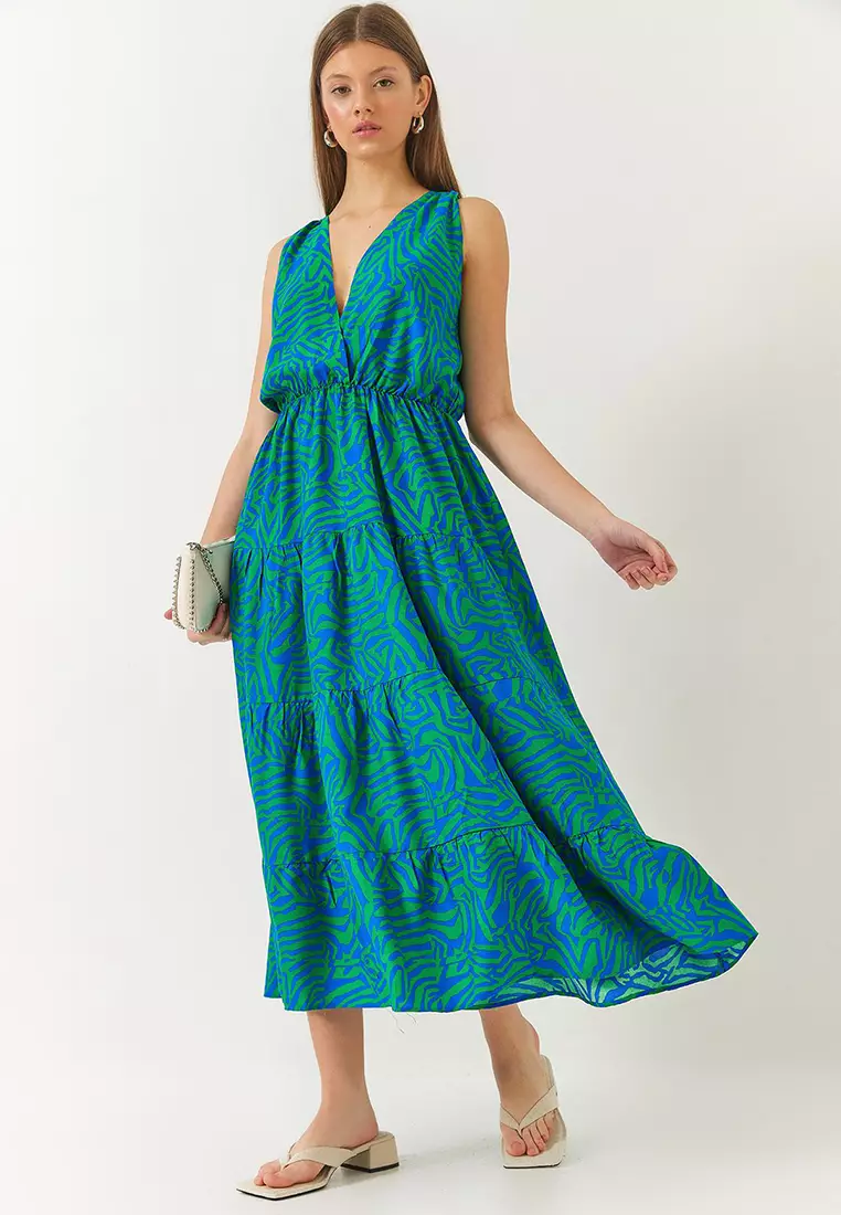 Women's Double Breasted Neckline Elastic Waist Back Rope Tie Print Dress 60261428