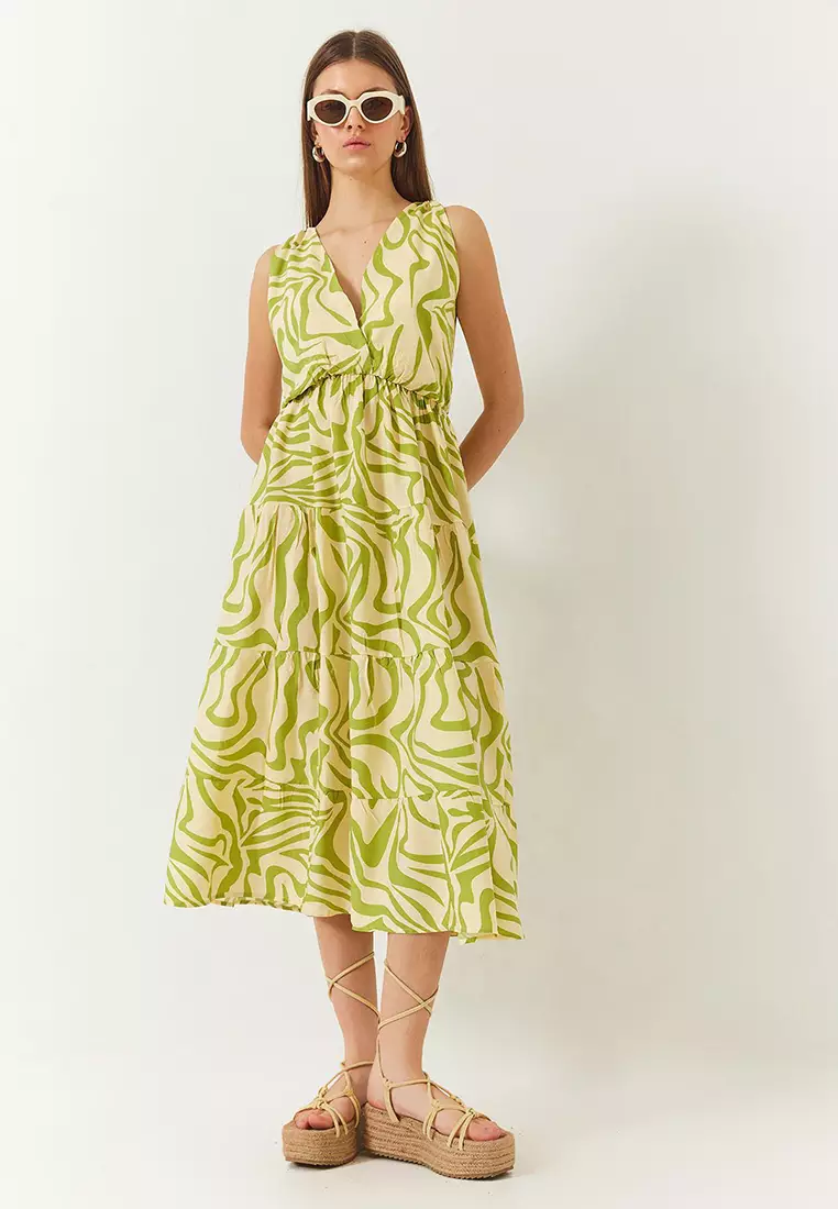 Women's Double Breasted Neckline Elastic Waist Back Rope Tie Print Dress 60261428