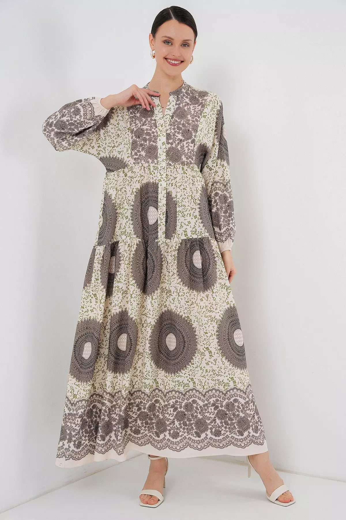 - Neck: Mandarin collar