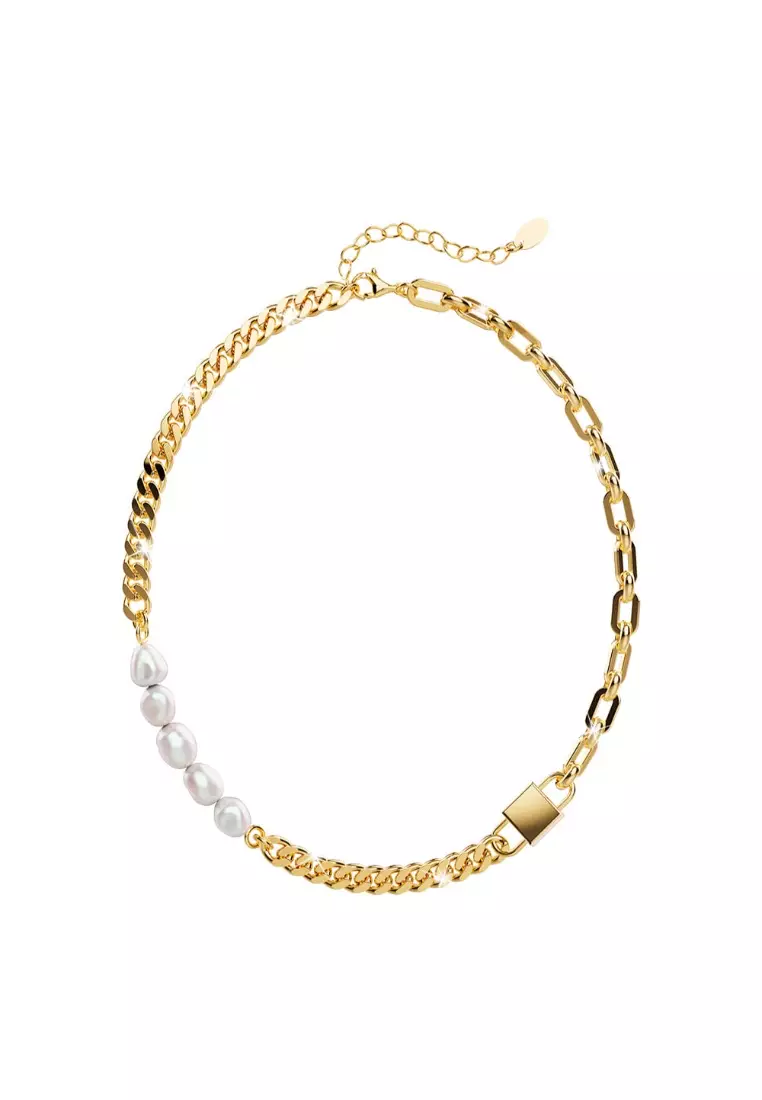 Paperclip Cuban Chain Link Pearl Necklace in Gold
