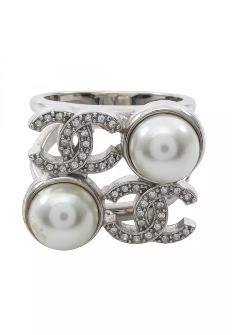 Pre-Loved Chanel coco mark ring ring Fake pearl Rhinestone Silver off white clear I25S