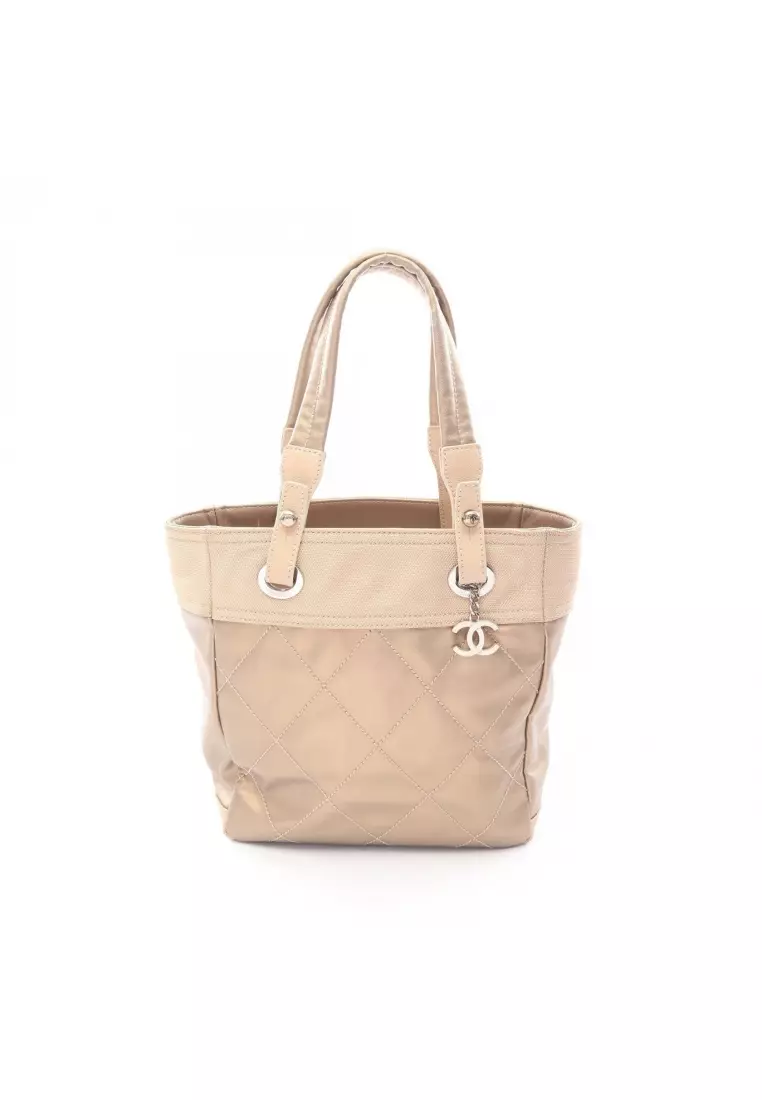 Pre-Loved Chanel Paris Biarritz PM Handbag tote bag Coated canvas leather Champagne Gold beige silver hardware