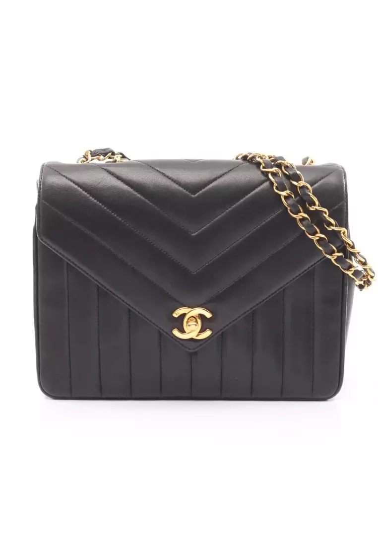 Pre-Loved Chanel V-stitch Chevron chain shoulder bag W chain shoulder bag lambskin black gold hardware
