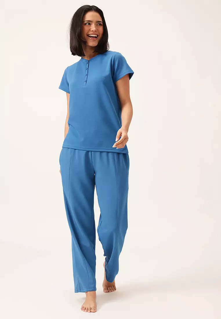 Clovia Chic Basic T-shirt & Pyjama Set in Blue - Waffle