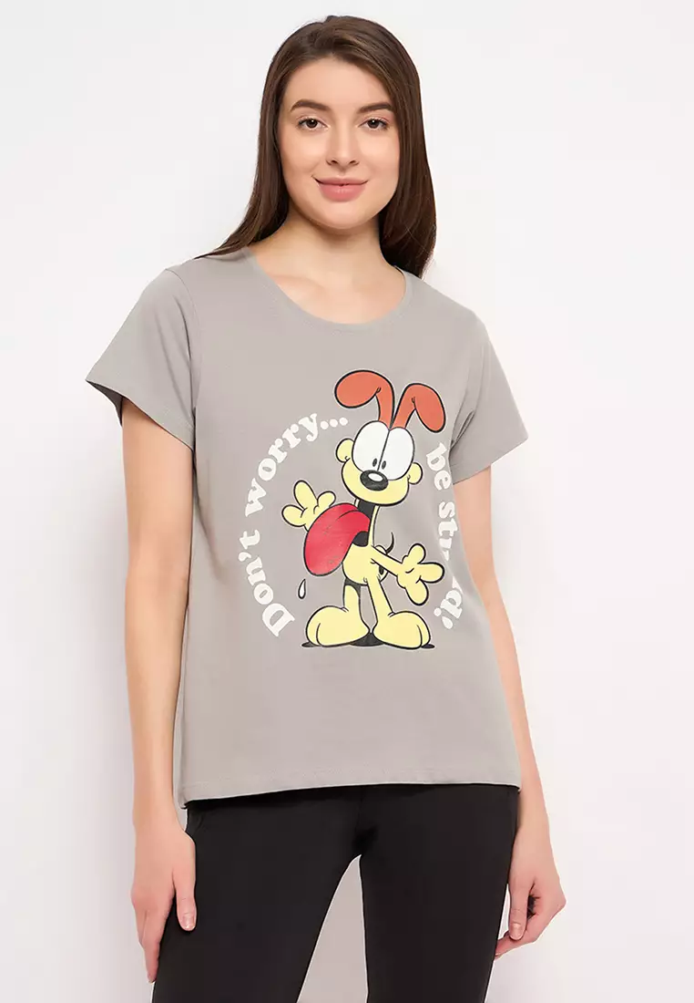 Clovia Garfield Print T-shirt in Light Grey - 100% Cotton