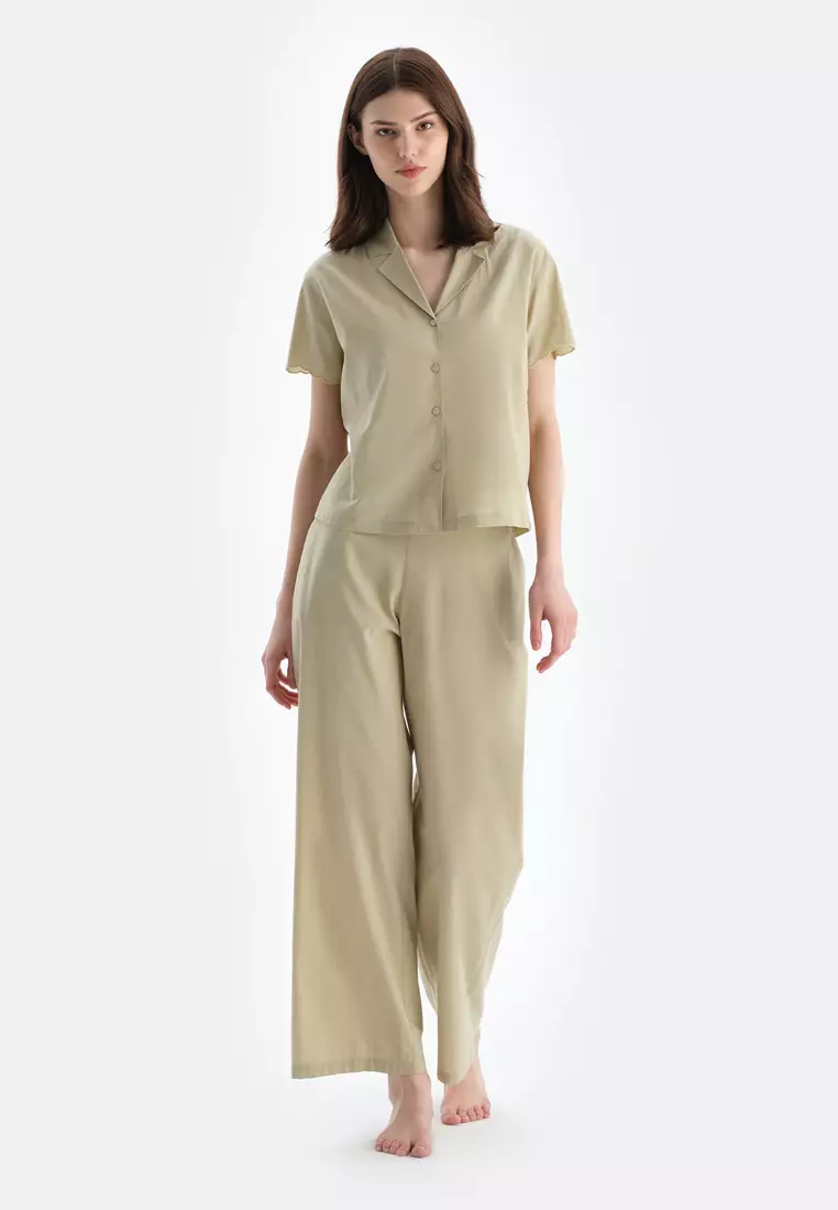 Light Green Woven Bottom Trousers, Regular, Long Leg, Sleepwear for Women