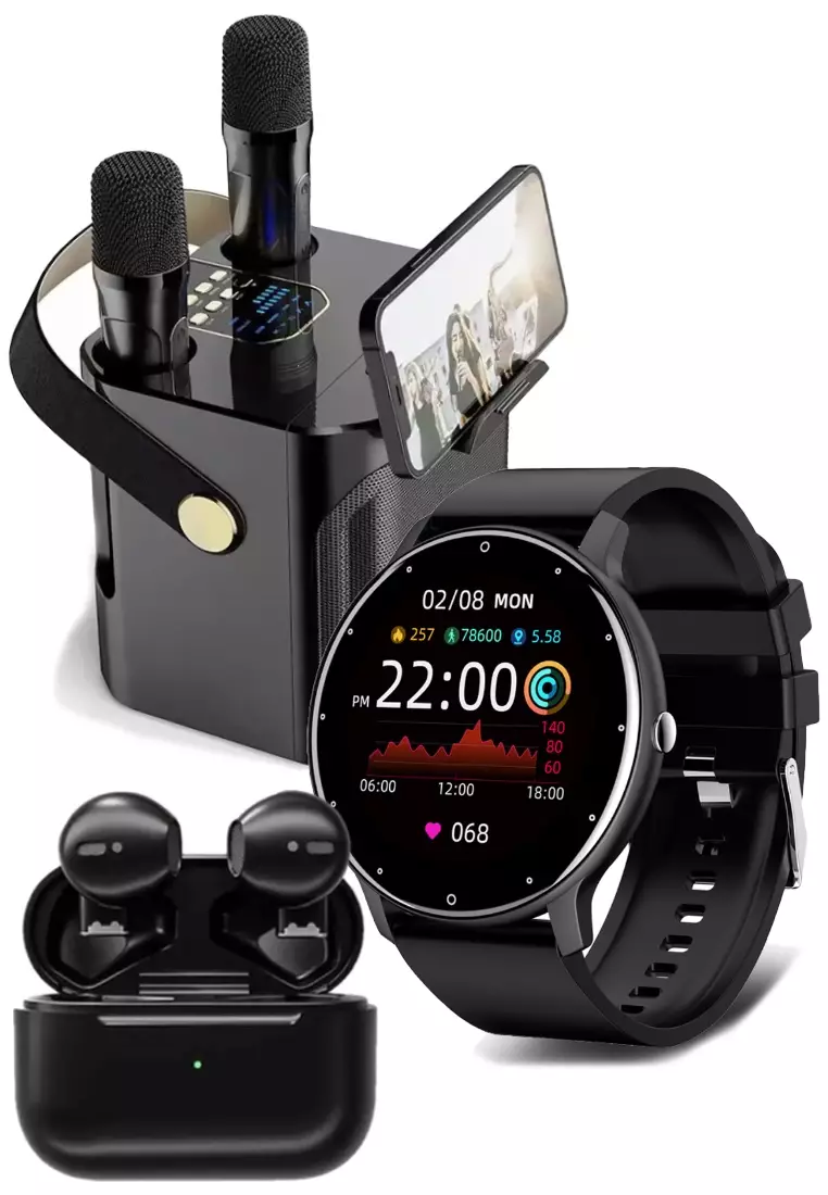 Tech Gift Set Value Deal - Unisex IOS/Android Black SmartWatch + 5s PRO MINI TWS wireless earphones + KTV Machine with two microphones