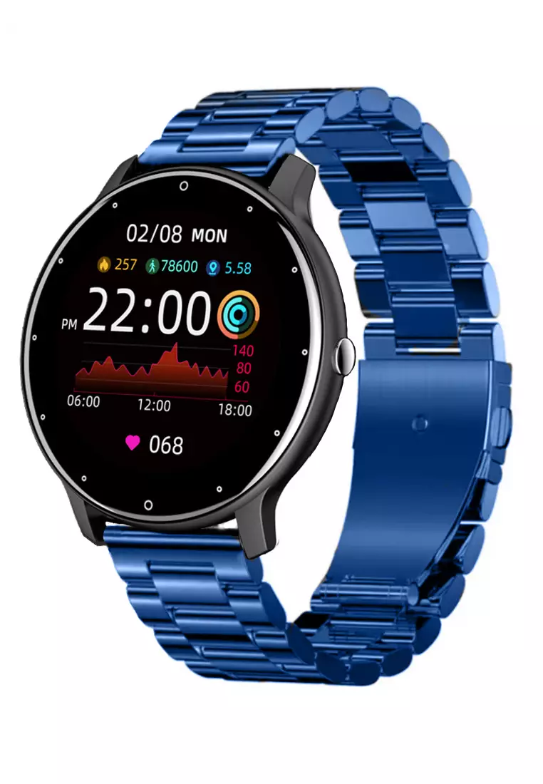 Unisex IOS/Android Black SmartWatch with IP Blue Stainless Steel Bracelet + 1 Free Black Rubber Strap