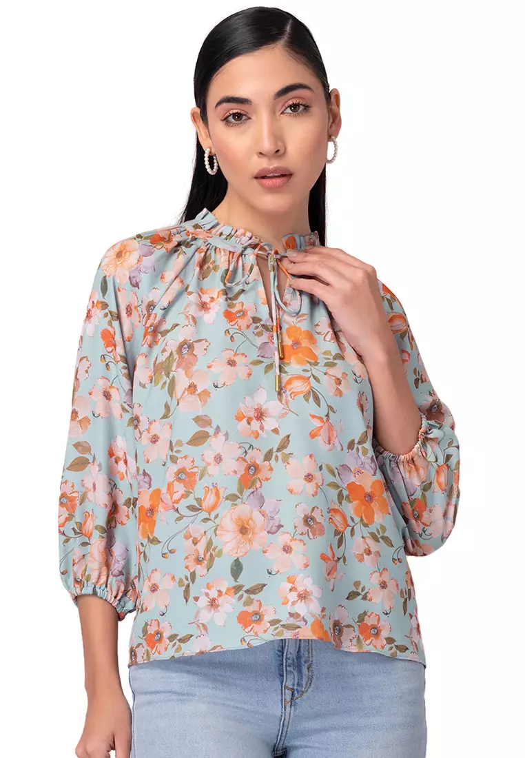 FabAlleyBlue Floral Raglan Sleeve Neck Tie Blouse2220.00777.00