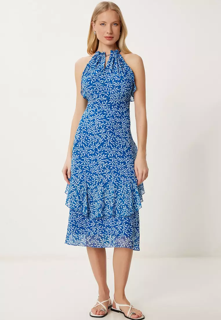 Happiness IstanbulWomen Dark Blue Patterned Flounced Summer Chiffon Dress Fg000252459.001496.00