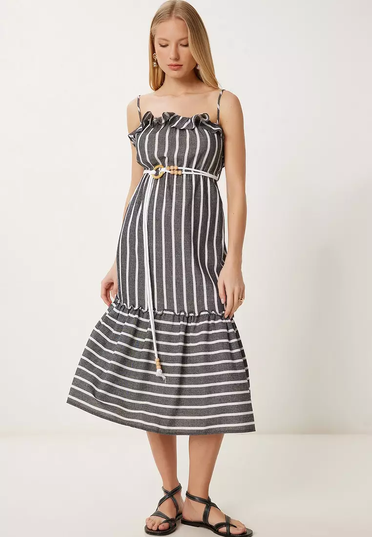 Women's Anthracite Bone Striped Flounced Summer Woven Dress Li00126