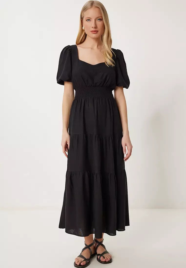 Happiness IstanbulWomen's Black Flounced Midi Linen Dress Fk000132979.002735.90