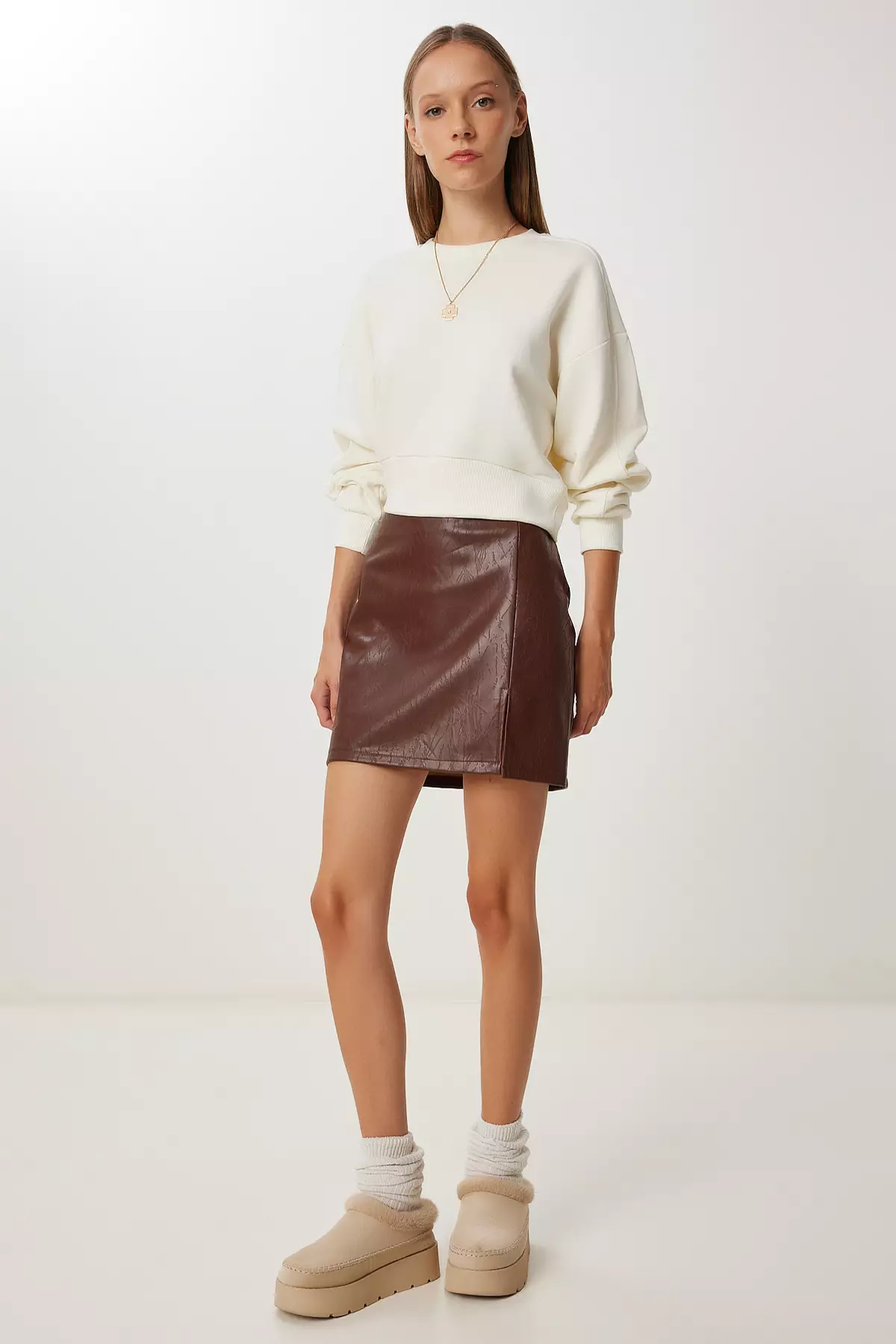 Happiness IstanbulWomen's Brown Patterned Slit Mini Faux Leather Skirt Gp000282299.001291.00
