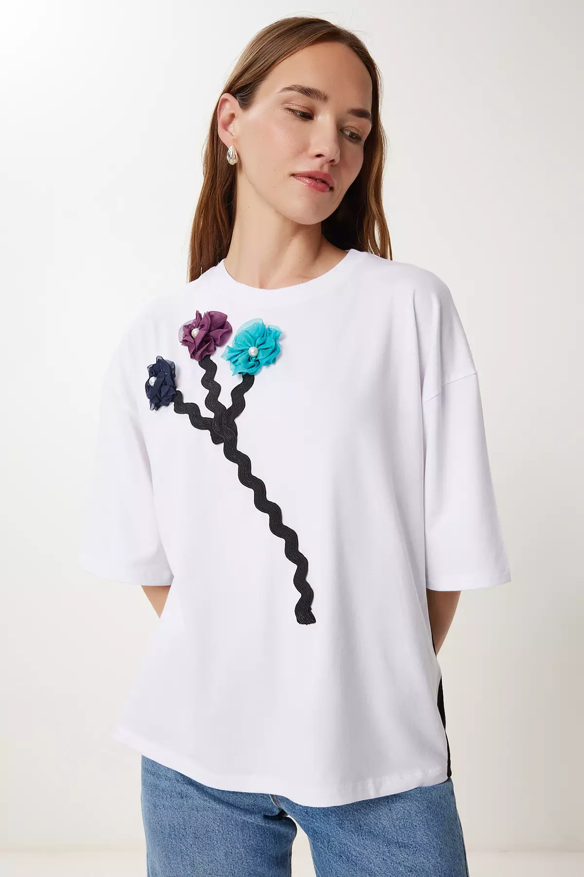 Happiness IstanbulWomen's White Flower Detailed Back Low-Cut Knitted T-Shirt Tp000861549.001068.90