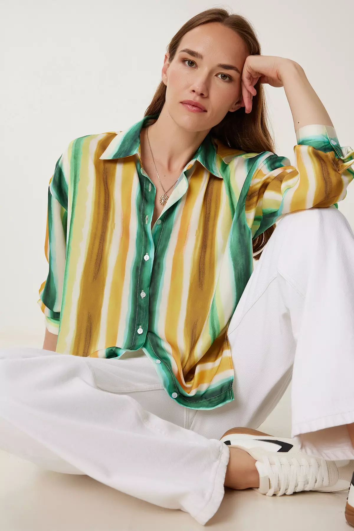 Women's Yellow Green Patterned Satin Surface Shirt Pb00042