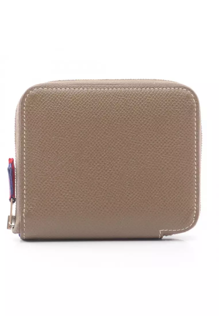 Pre-Loved Hermès Azap Compact silk in Etoupe round zipper wallet Veau epsom Gray brown silver hardware □ R stamp