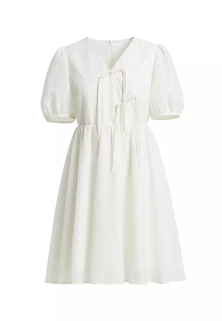 Puff Sleeve V-Neck Bridesmaid Dress with Stitching Artwork