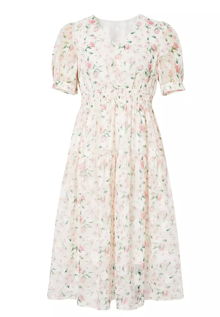 HopeshowPuff Sleeve V-Neck Floral Dress with Ruched Waist Design1948.90